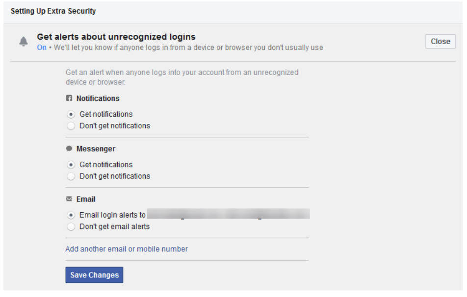 This area allows you to set alerts when a new device or browser is used to log into your Facebook. The menu allows you to define additional email addresses. You can also have those notifications sent to you via Facebook Messenger, SMS, or as a Facebook notification.