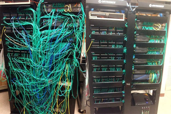 Once your cooling system is taken care of and your servers are in place, you will inevitably be adding more hardware as your needs/business grows. This will result in a lot of new wires and cables connecting elements of your server rack. If you aren’t careful, good intentions could turn into a complete mess. With wiring a tedious process, after only a little while, your server cabinet could end up looking like the one pictured on the left.